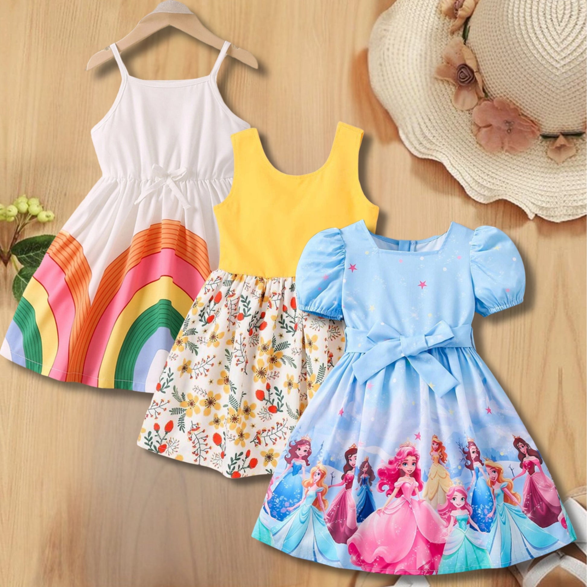 Baby Girl's Floral & Rainbow & Princess Dresses_Frocks (Combo Pack 3) for Kids. (For 6 Month to 10 Year)